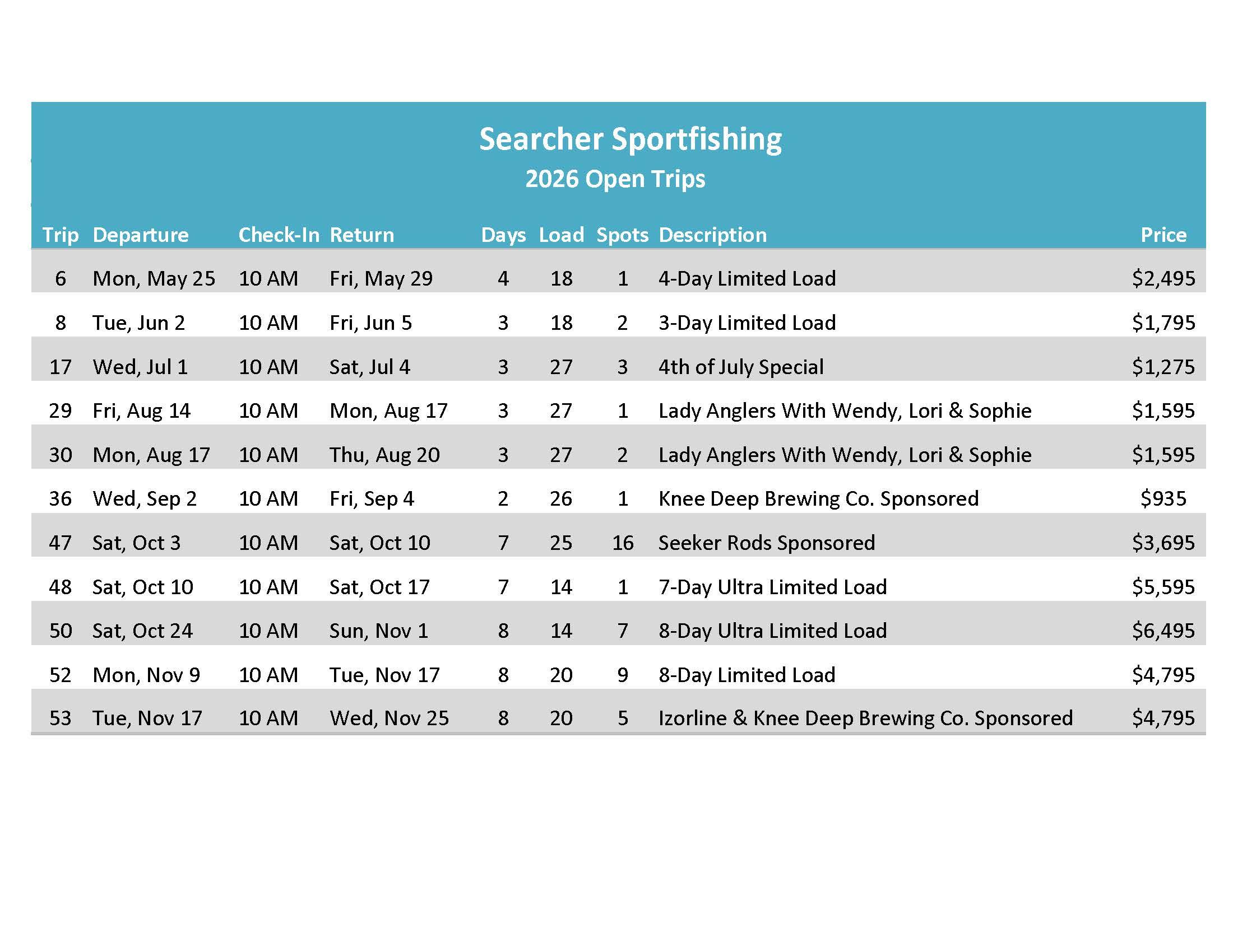 Interested in chartering a trip in 2026 or 2027. Send us an email at office@searchersportfishing.com or call the office, 619-226-2403.