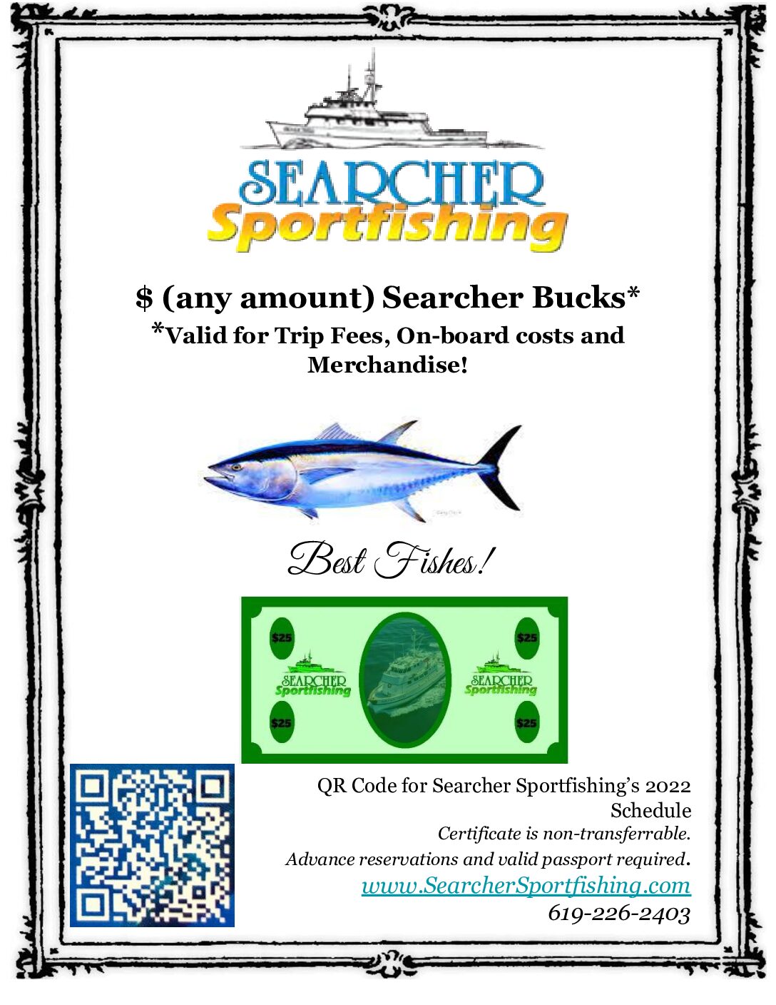 *Searcher Bucks can be used for trip costs, galley tabs, on-board tackle and merchandise.
