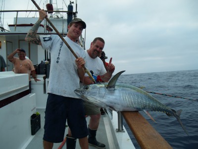 Hello anglers, Arrived at Alijos Rocks around 9:30 this morning. The weather is great and the water temps are the same as last trip. Boats already here have a few fish aboard and are seeing fish boil around. Our first fish was a wahoo landed by our re-ride passenger Ken Piel from Oregon. He bought a brand new Calstar rod and an Avet reel at Fishermans Tackle Shop upon arrival from his first trip to Alijos last weekend and it paid off! He landed the first fish of the trip and it was a wahoo on straight mono to boot. Pretty lucky for Ken. The tuna fishing is a little on the slow side so far, but we see plenty of fish around the boat. They are not biting right now but I’m sure we will get busy later. More this evening, Capt Art