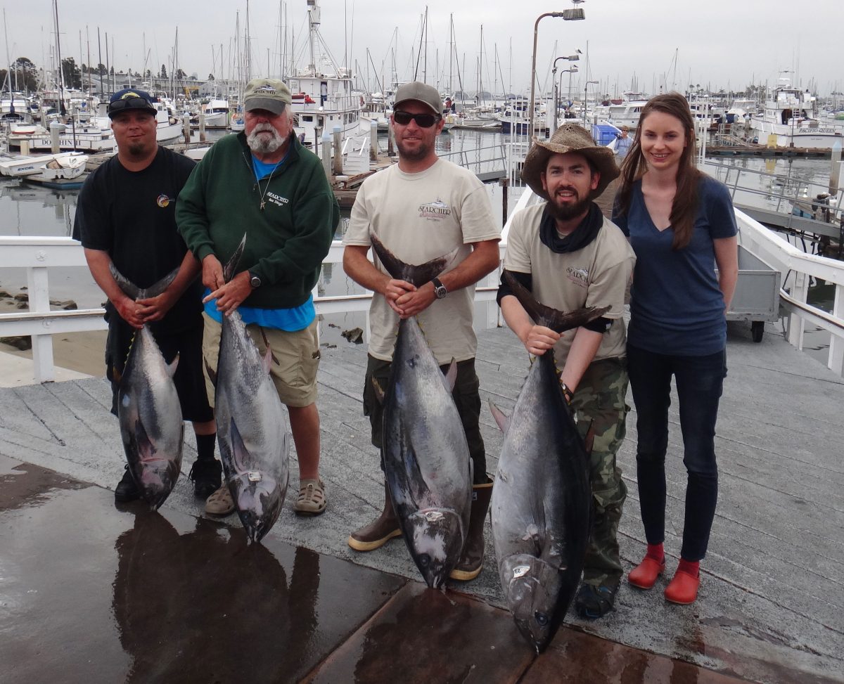 - Honorable mention goes to Greta Bower-Fjellstrom of Redlands, CA for her 68# bluefin, not eligible for jackpot. Greta is assisted by her husband Chris on second right. Nice fish, Greta!